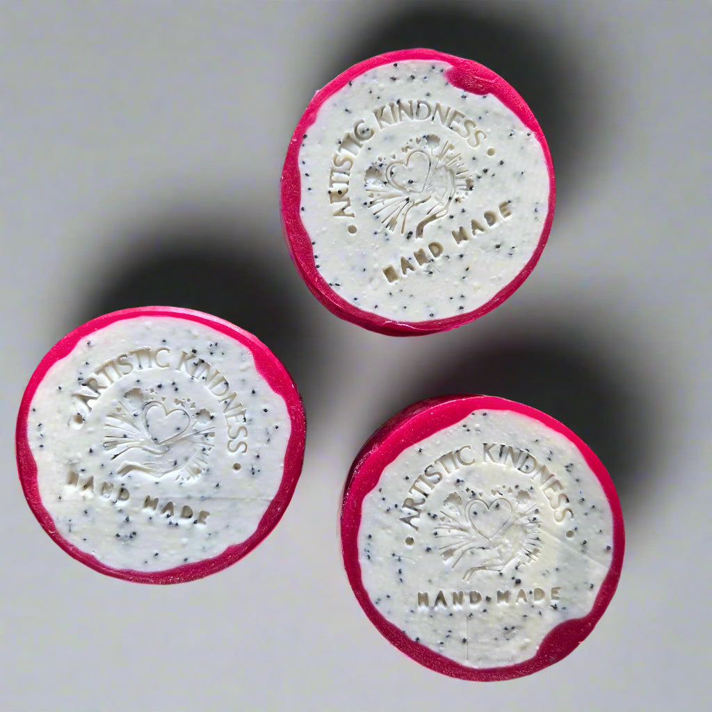 Dragonfruit Bloom is a juicy, tropical escape wrapped in a burst of color. This round bar features a bright pink outer ring, a creamy white center, and a sprinkle of poppy seeds for gentle exfoliation — a playful nod to the vibrant look of real dragon fruit. The scent is an explosion of ripe, juicy fruits, softened by delicate floral undertones. Sweet, refreshing, and full of life.
