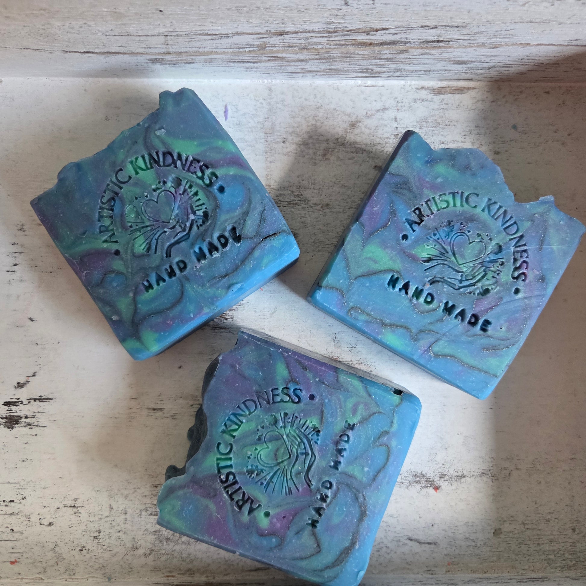 Mermaid Magic is a vibrant swirl of blue, purple, and teal that captures the sparkle and mystery of the ocean depths. Infused with a sweet tropical blend of coconut, mandarin, red currant, and dates, this soap wraps you in a spell of exotic fruitiness and creamy delight. Let the mystery of the sea whisk you away to a world where every day feels like an underwater adventure.
