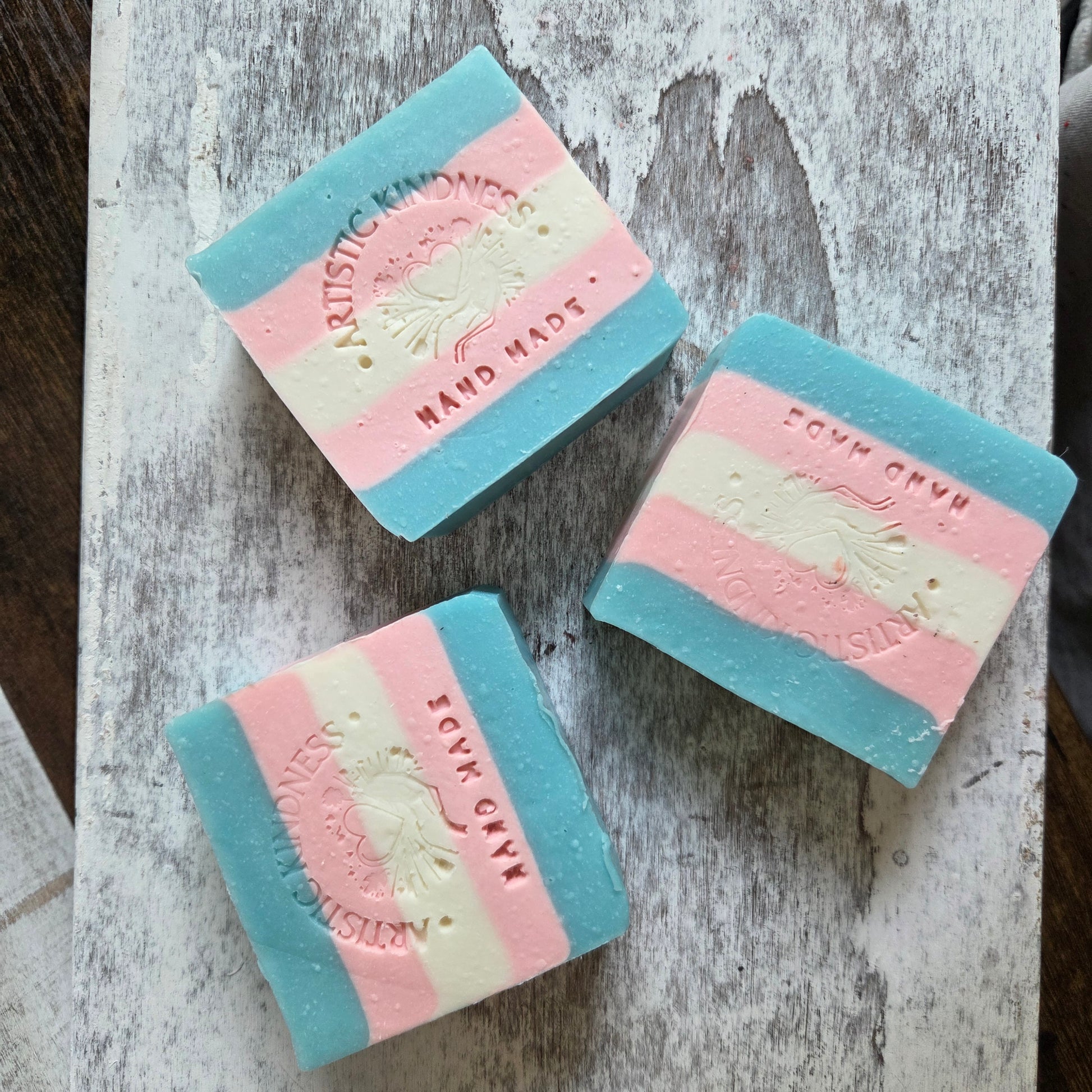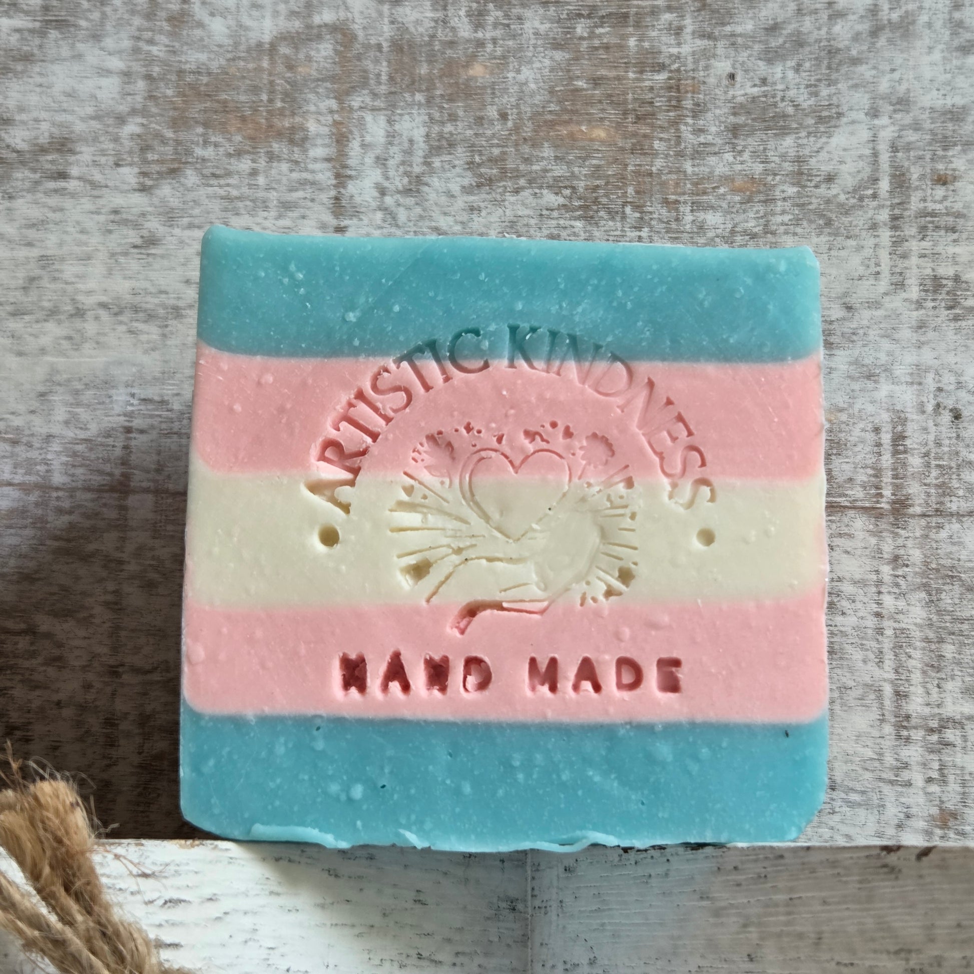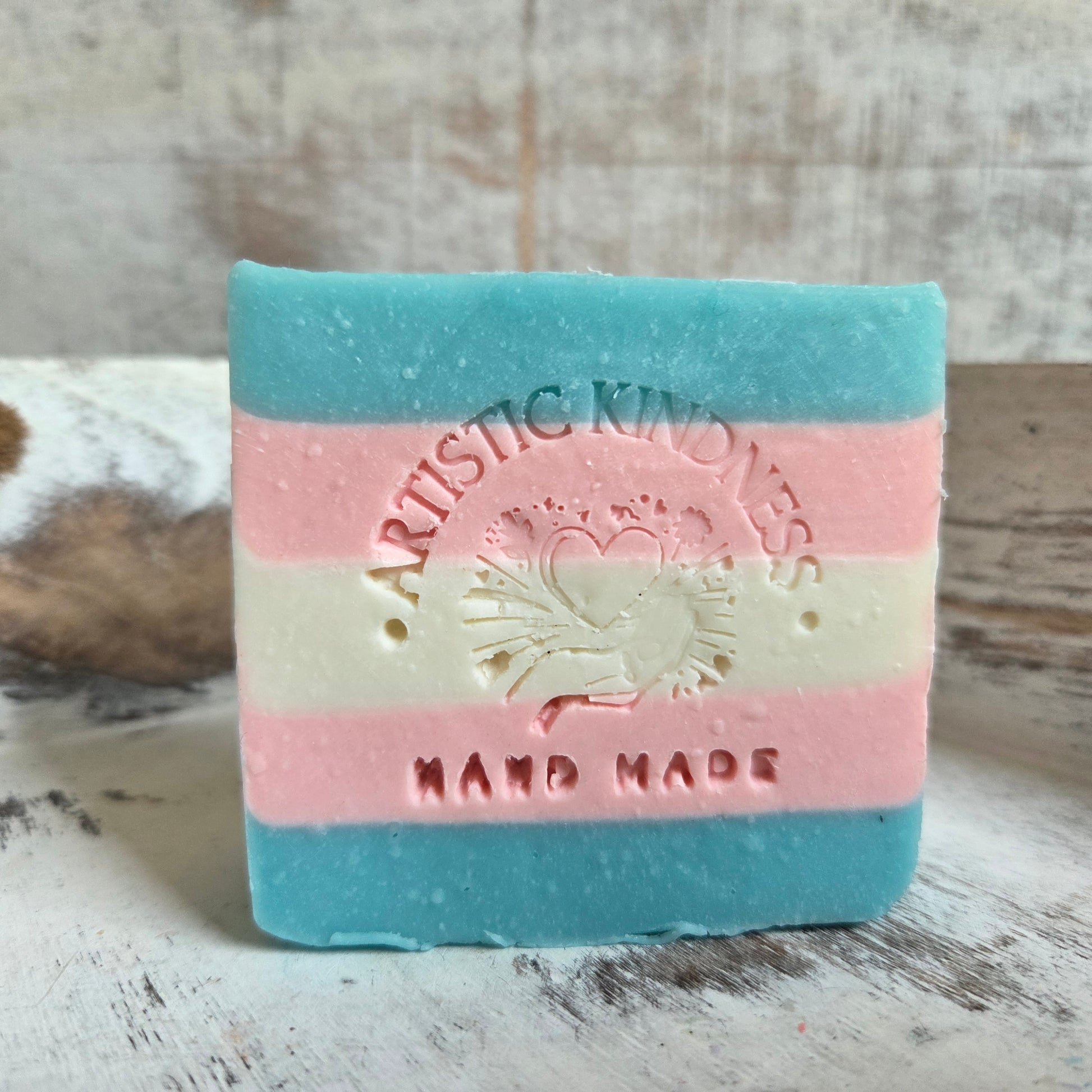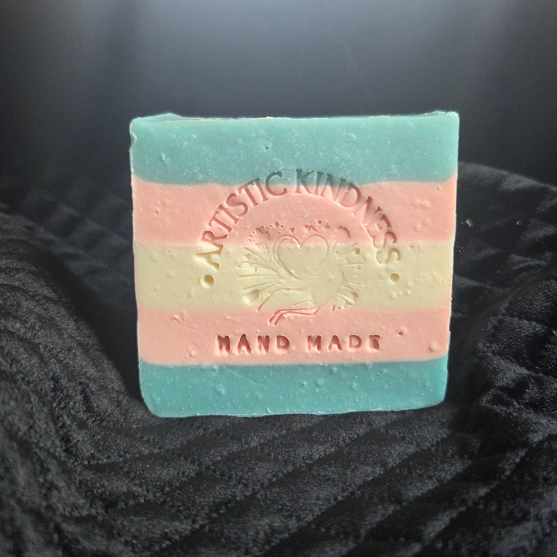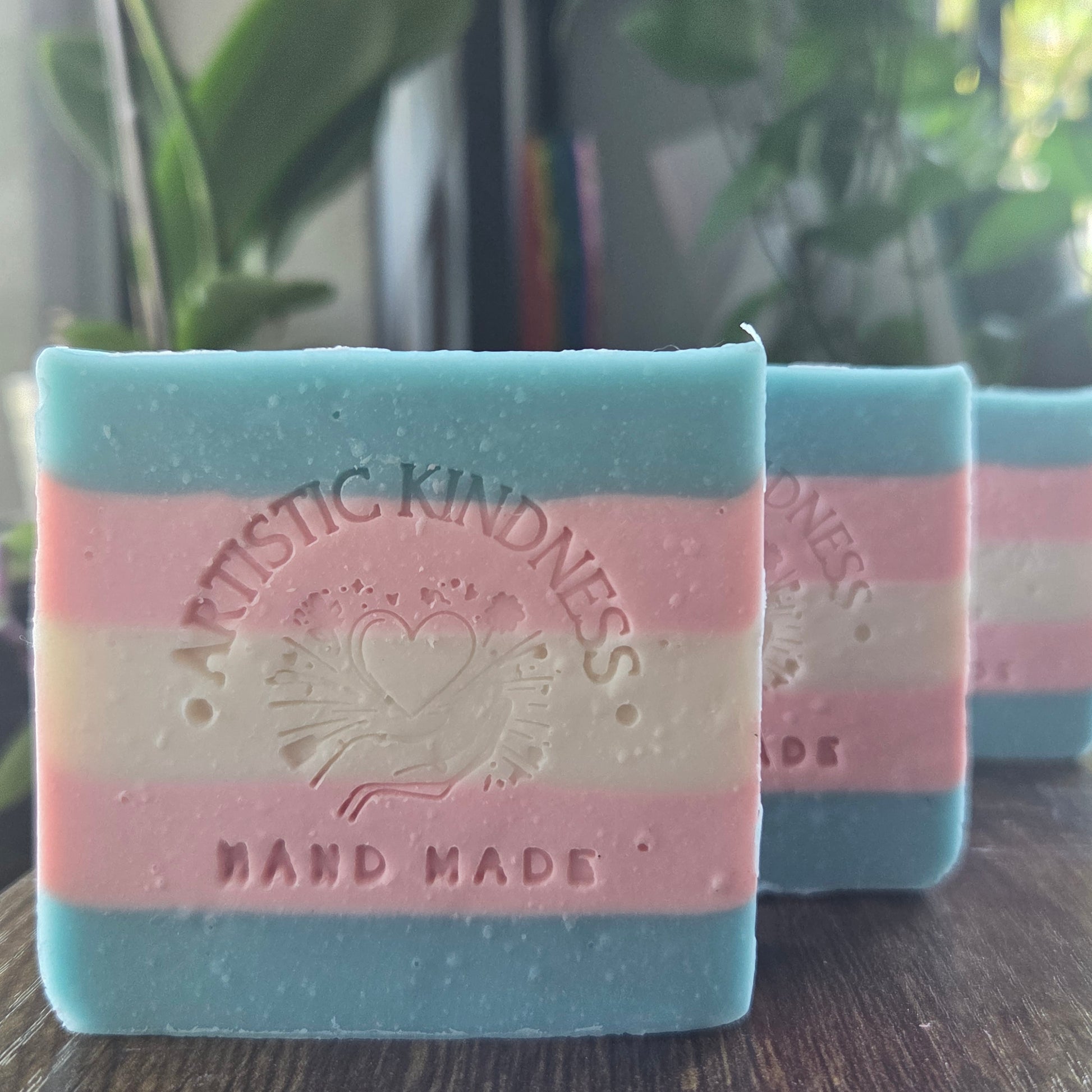 Trans & True is a soft and radiant tribute to identity and affirmation, inspired by the colors of the transgender pride flag. Lines of pastel pink, blue, and white wrap this bar in gentle beauty, while the scent is tender and uplifting — a delicate blend of mandarin, lemon, orange blossom, and magnolia, grounded with soft vanilla, amber, and musk. It’s a love letter to being fully, wonderfully yourself.